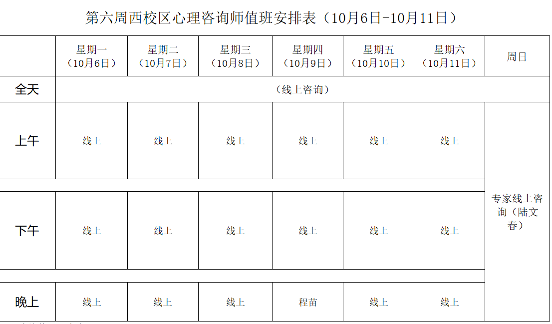 3.西校区值班室地址:男生宿舍与女生宿舍中间心理咨询室。
