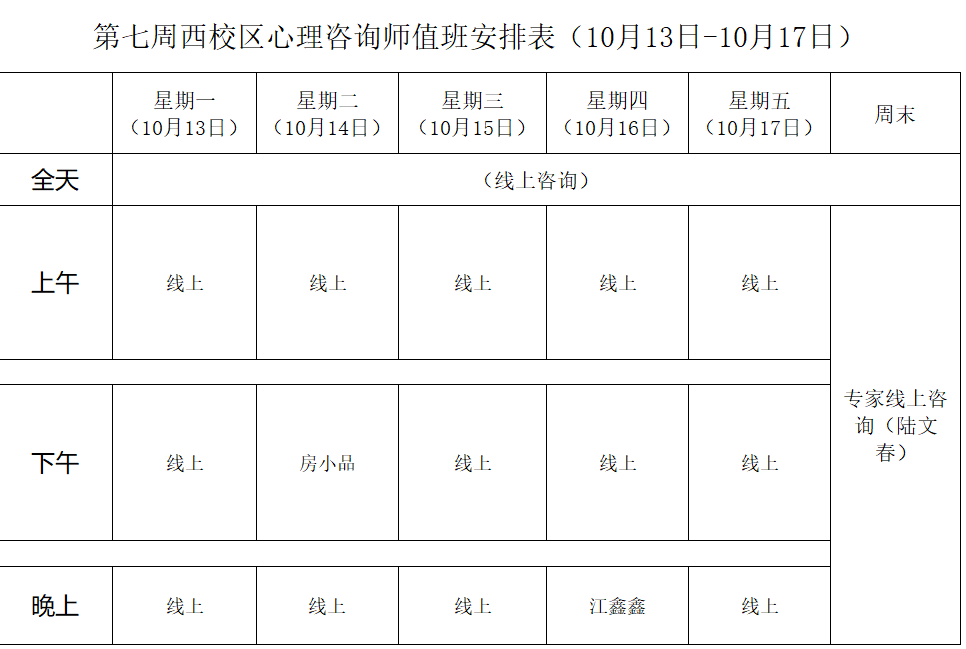 3.西校区值班室地址:男生宿舍与女生宿舍中间心理咨询室。