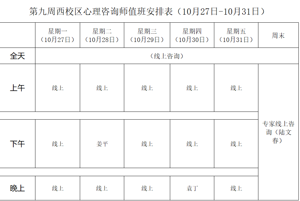 下一条:2025年秋季学期心理咨询师值班安排表第八周(主西校区)