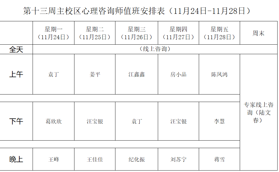 上一条:2025年秋季学期心理咨询师值班安排表第十四周(主西校区)