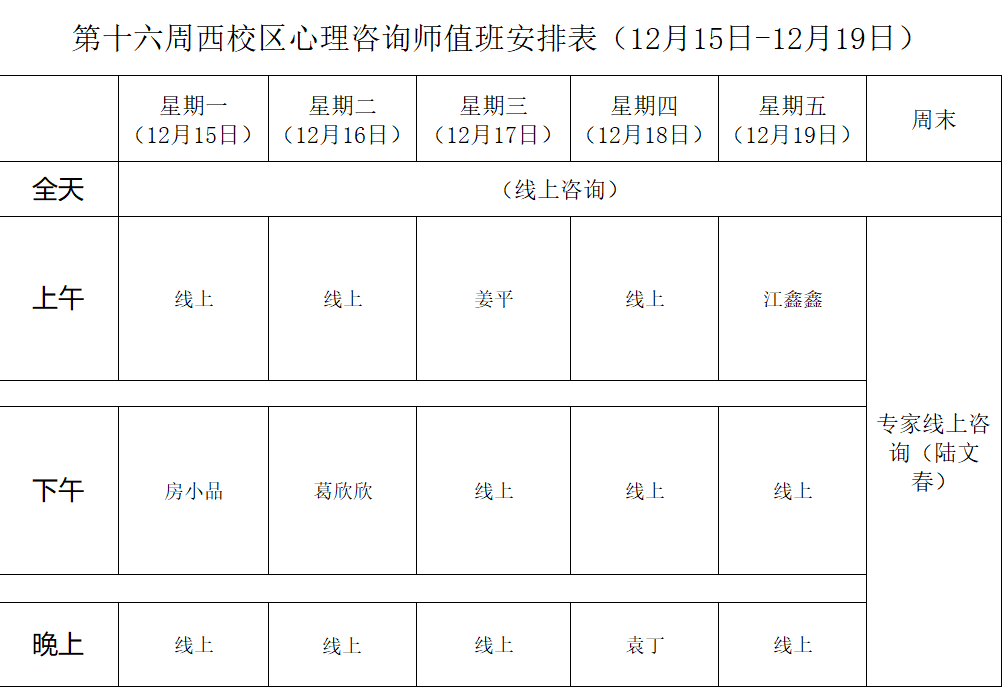 3.西校区值班室地址:男生宿舍与女生宿舍中间心理咨询室。