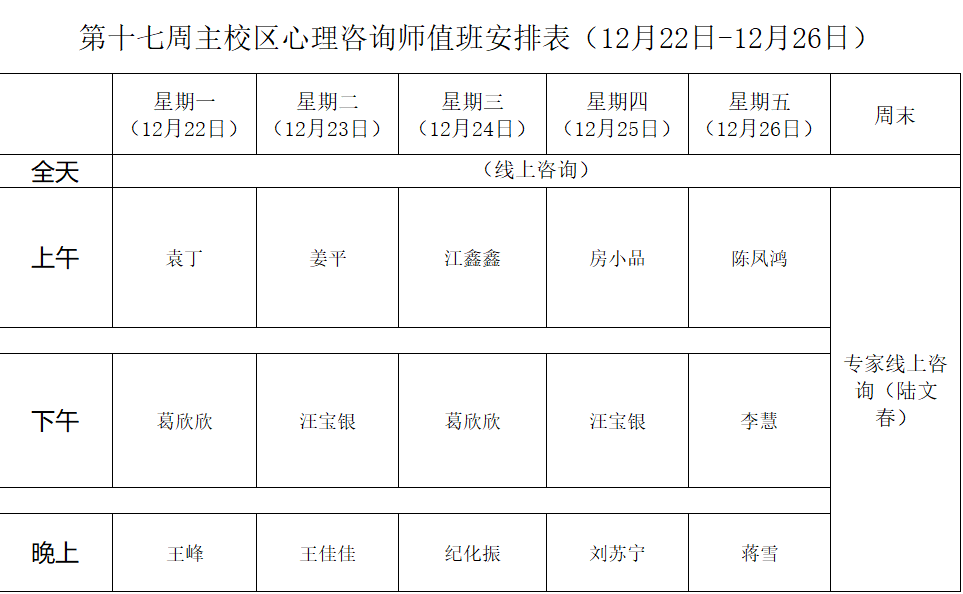 下一条:2025年秋季学期心理咨询师值班安排表第十六周(主西校区)