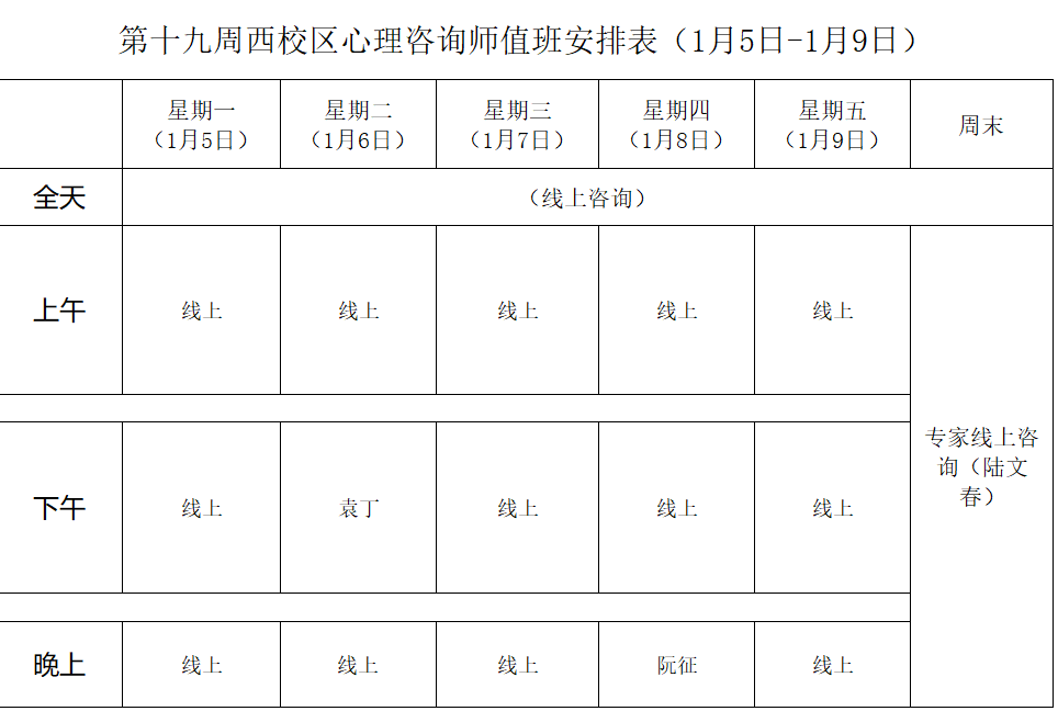 3.西校区值班室地址:男生宿舍与女生宿舍中间心理咨询室。