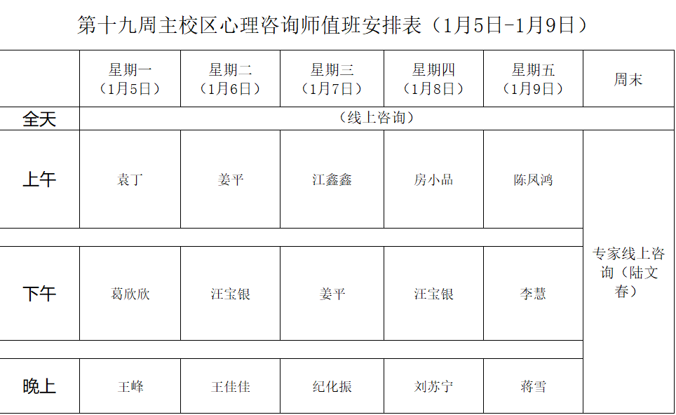 下一条:2025年秋季学期心理咨询师值班安排表第十八周(主西校区)