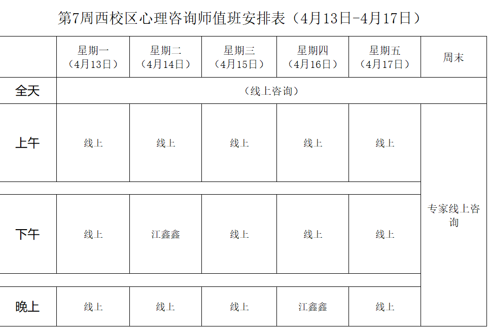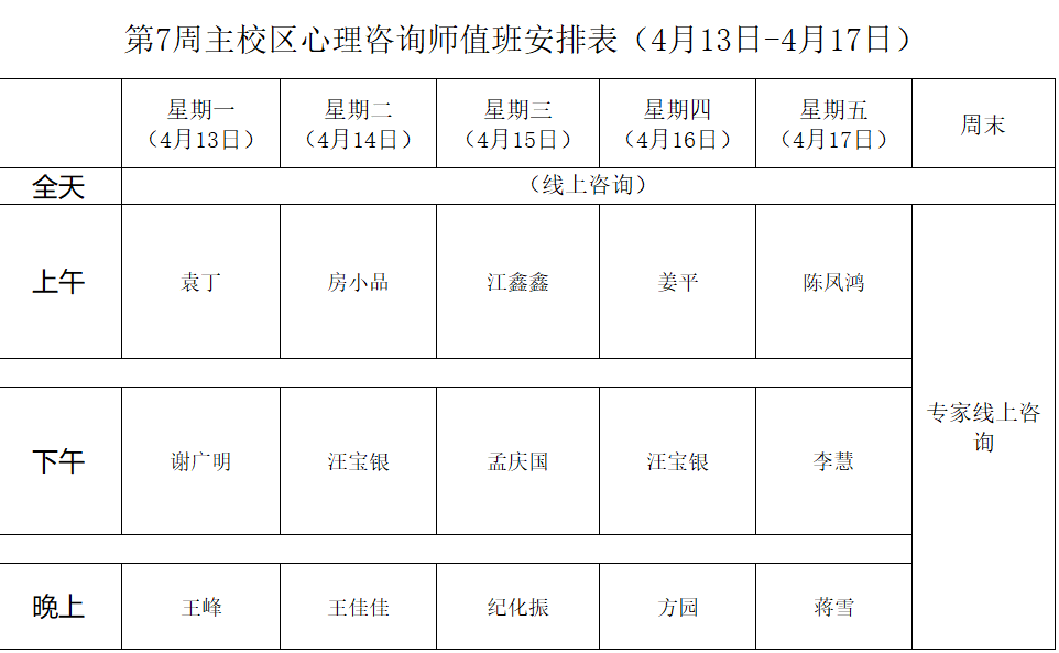 下一条:2026年春季学期心理咨询师值班安排表第四周(主西校区)